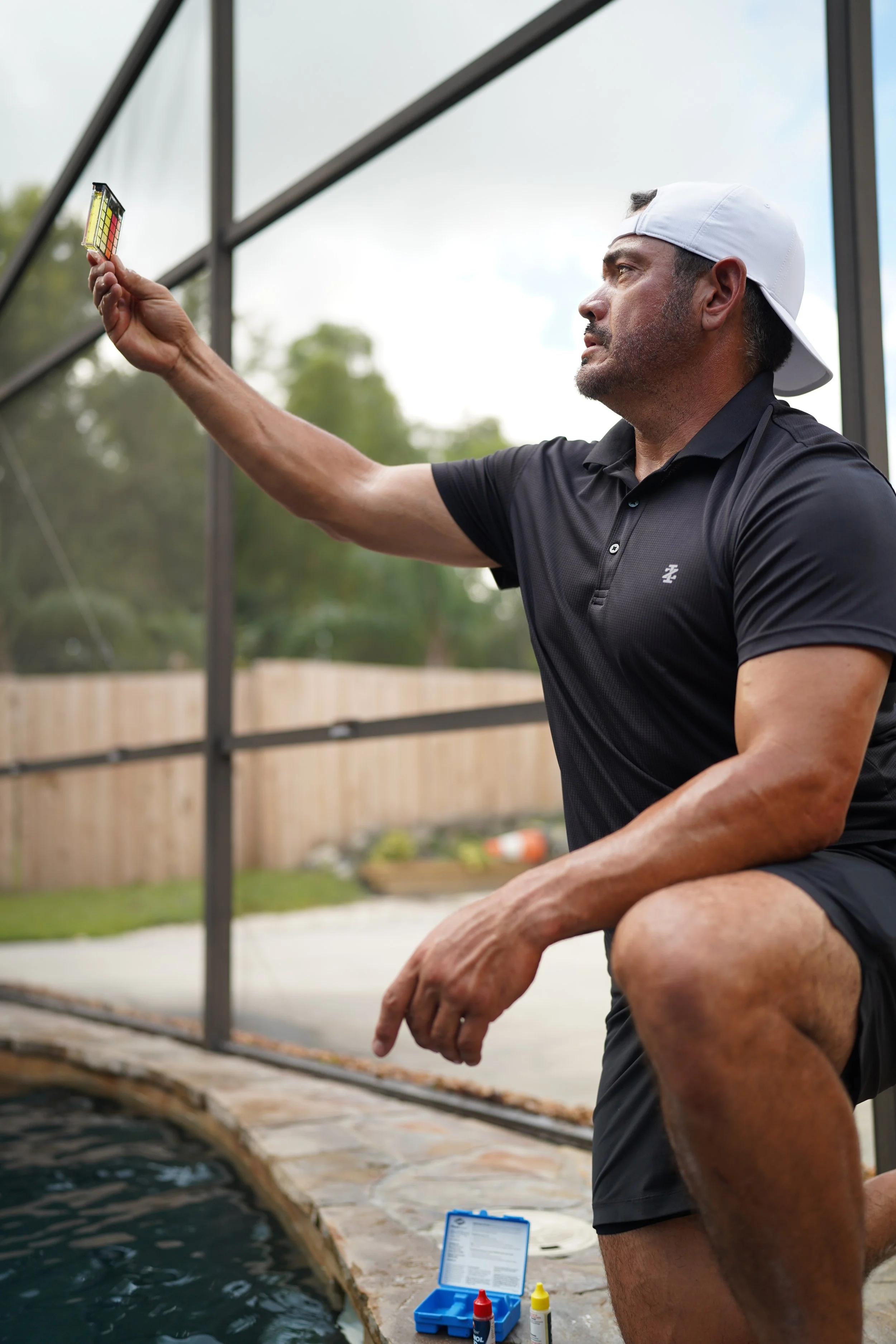 • Test water chemistry (pH, chlorine, alkalinity, stabilizer, calcium hardness, salt if applicable)